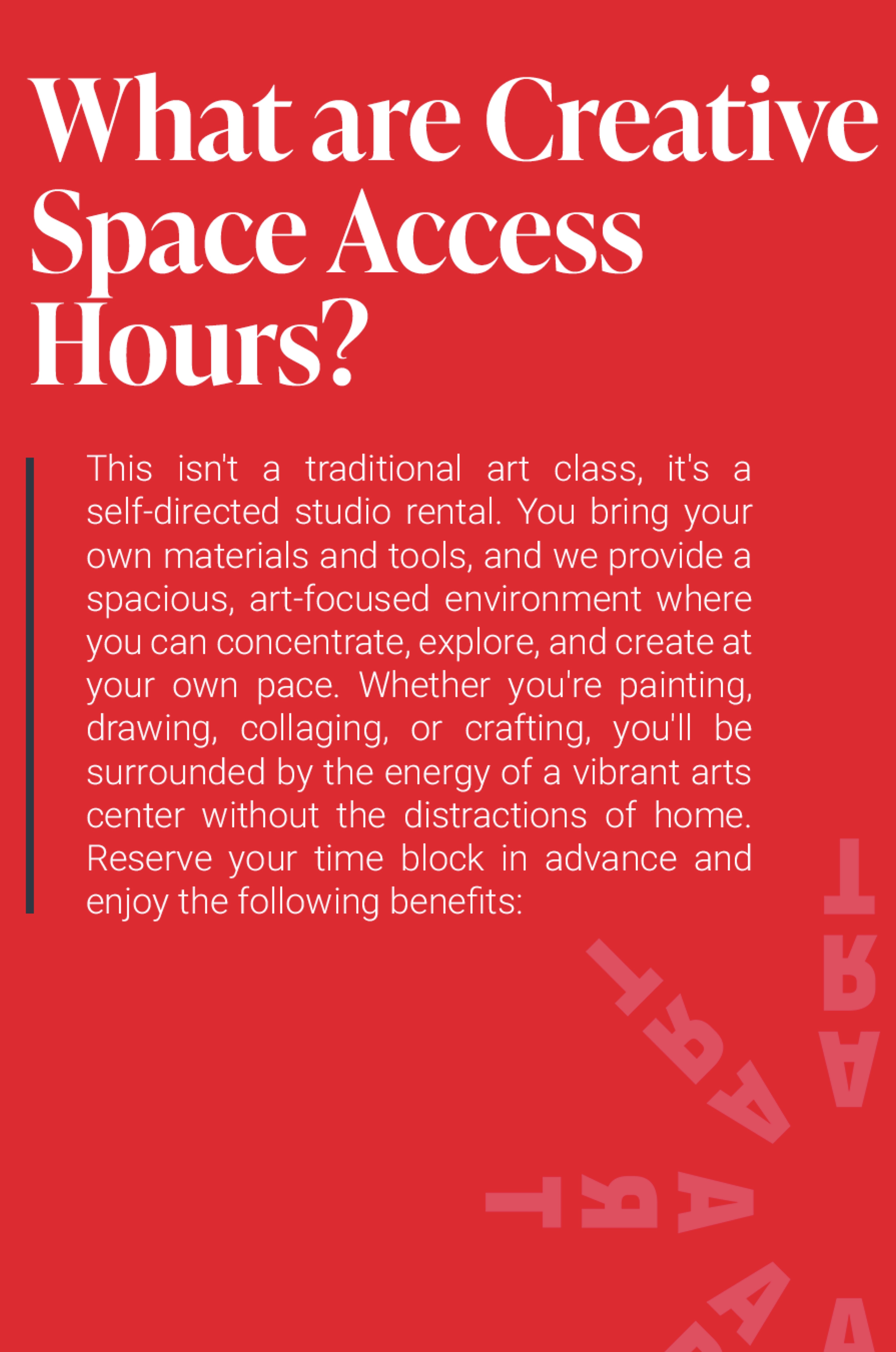 Artists can drop in for $25 per hour as needed, or choose our new $200 monthly option for unlimited studio access throughout the month. Please note that spaces may be shared with other working artists, adding to the sense of community and creative energy within the building.