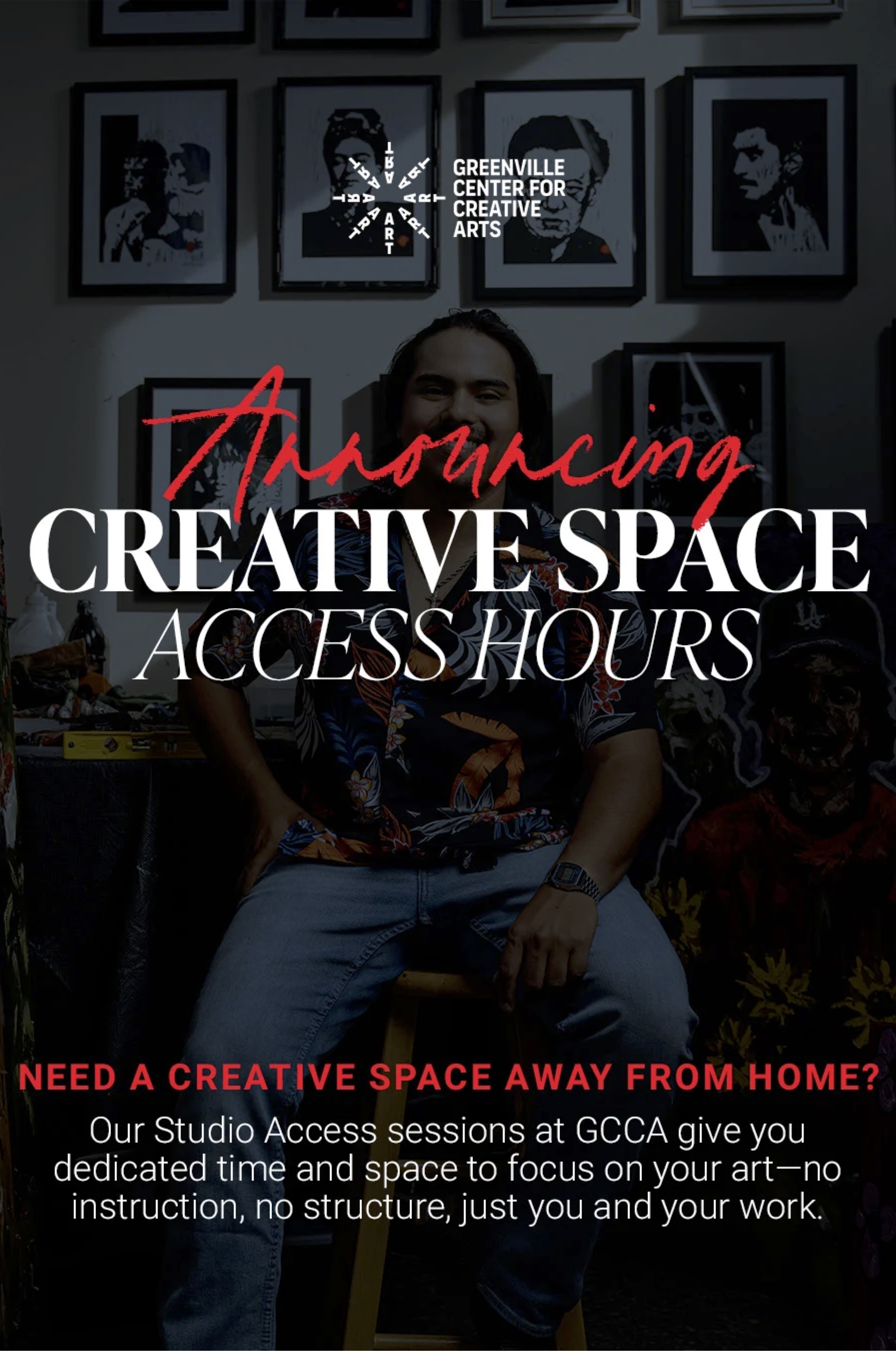 Whether you’re polishing a new series, experimenting with materials, or just seeking a refuge from home distractions, we’re here to make space for your process. To reserve your spot or learn more, reach out to our Operations Director, Alicia Mizuno, at alicia@artcentergreenville.org.