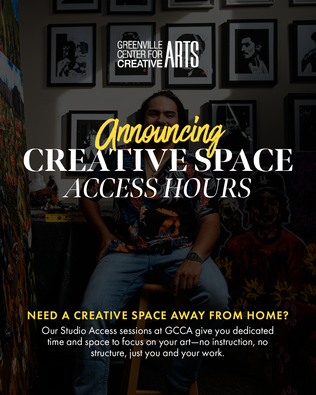 Whether you’re polishing a new series, experimenting with materials, or just seeking a refuge from home distractions, we’re here to make space for your process. To reserve your spot or learn more, reach out to our Operations Director, Alicia Mizuno, at alicia@artcentergreenville.org.