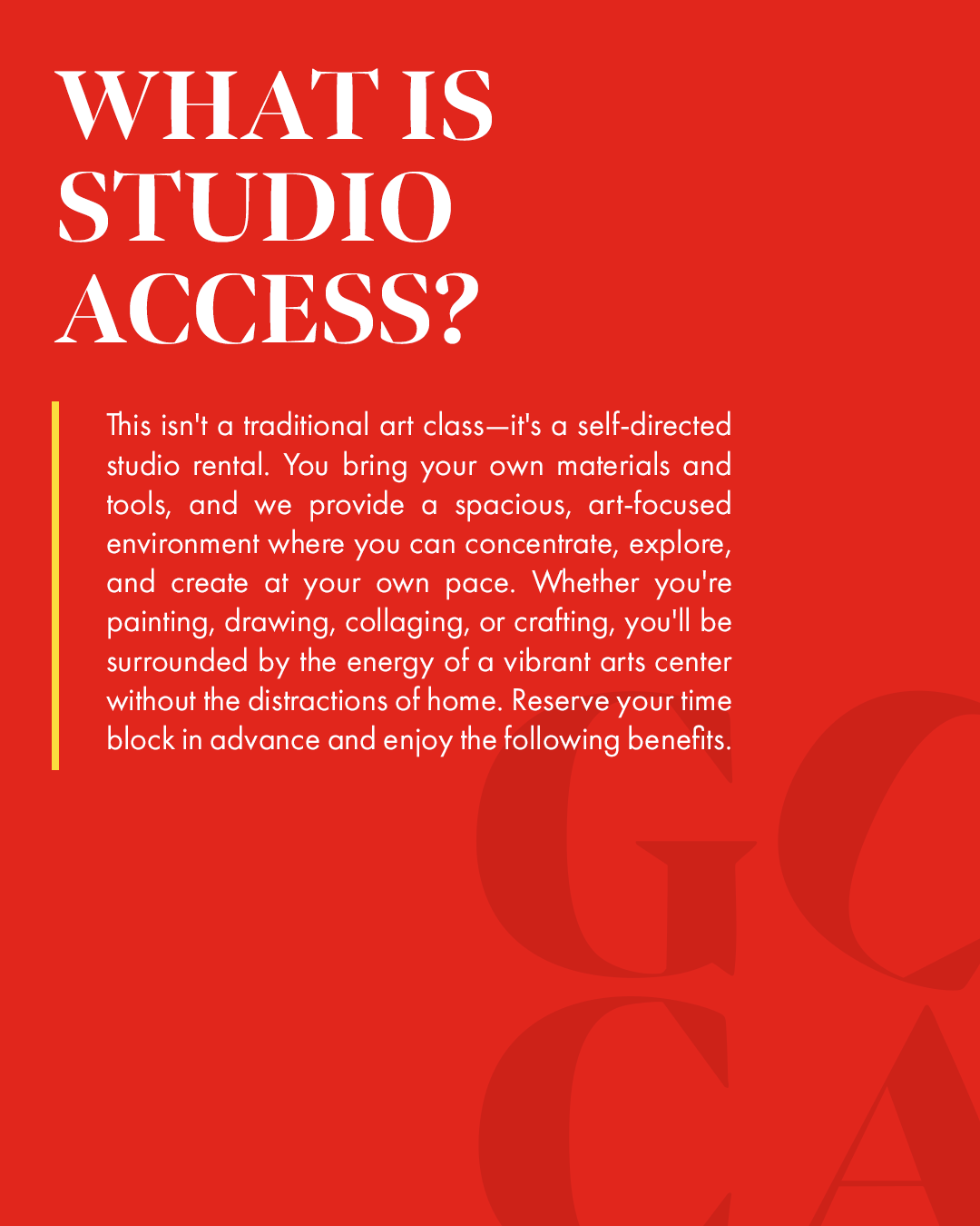 If you’re craving a quiet, inspiring place to get lost in your work but aren’t ready to commit to a full studio rental, our Creative Space Access Hours at GCCA are designed to give you exactly that. These sessions offer an open, unstructured studio environment with no instruction and no formal programming, simply dedicated time and room to create at your own pace.