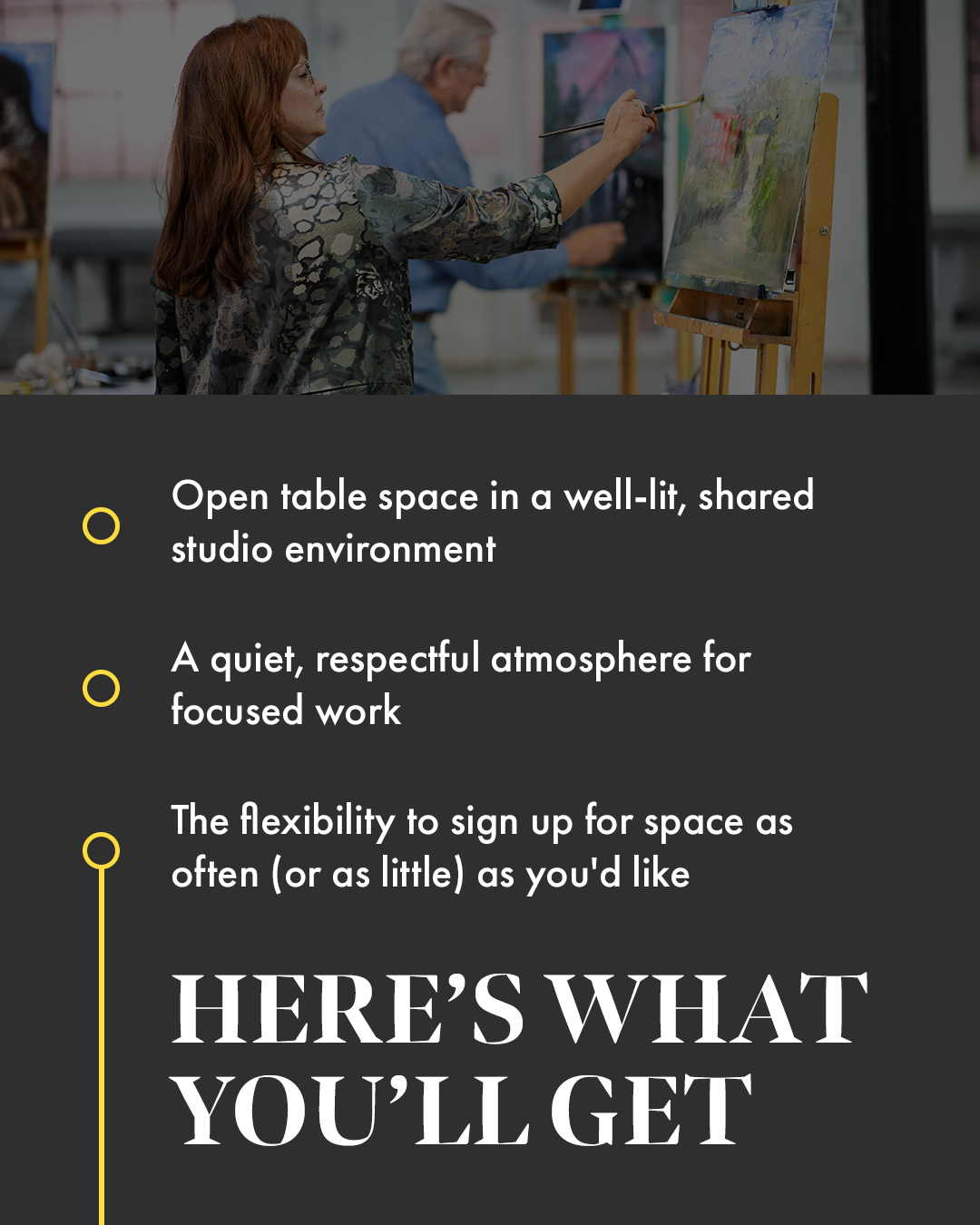 Artists can drop in for $25 per hour as needed, or choose our new $200 monthly option for unlimited studio access throughout the month. Please note that spaces may be shared with other working artists, adding to the sense of community and creative energy within the building.